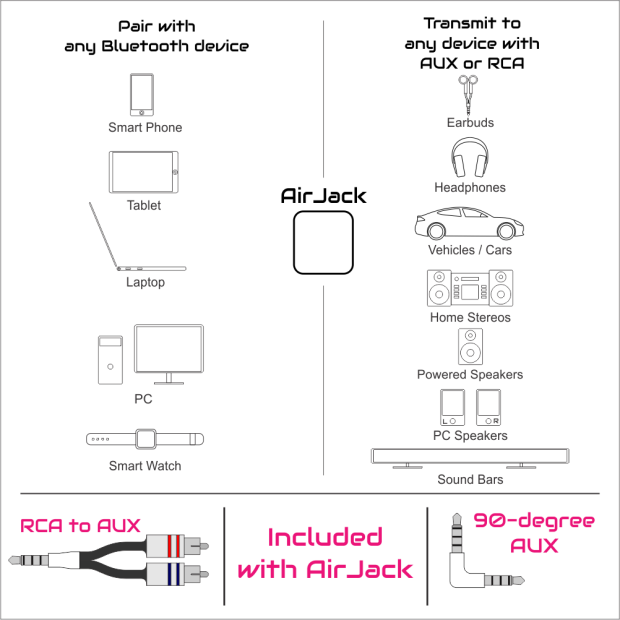 AirJack is the ultimate wireless solution! Combining high-quality with low-cost, AirJack gives your current gear a new lease on life. Adapt almost any audio device to high-quality Bluetooth.